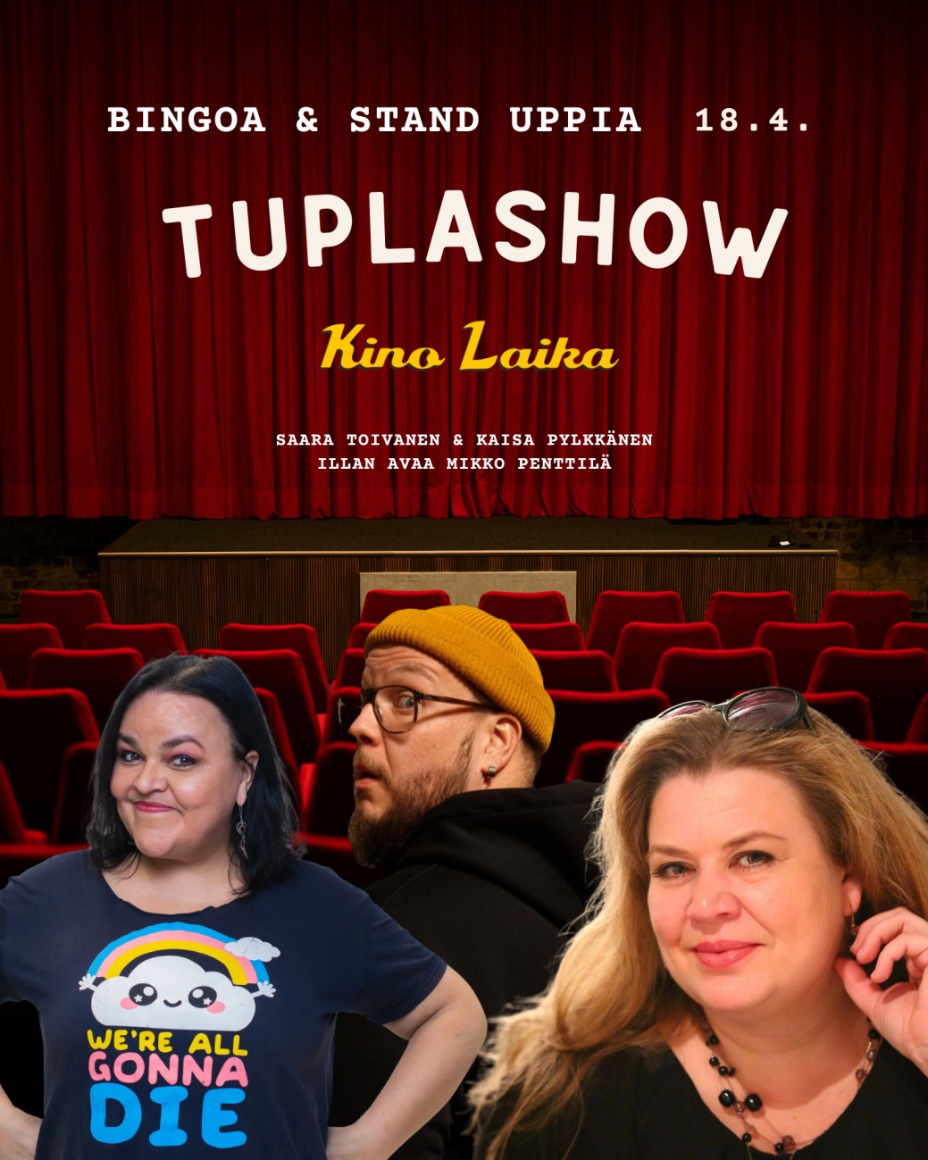 Kino Laikassa saadaan nautiskella taas bingosta sekä stand uppista, kun stagen ottavat haltuun Saara Toivanen ja Kaisa Pylkkänen! Luvassa on jännitystä ja naurua tihkuva tuplashow, joka ei varmastikaan jätä ketään kylmäksi. Lämmittelijänä illan polkaisee käyntiin Mikko Penttilä! Mikko katselee maailmaa ja ihmisiä valtavalla mielenkiinnolla, mutta hieman vinksahtaneella katseella ja löytää arkisistakin asioista kieroja näkökulmia. Penttilä […]