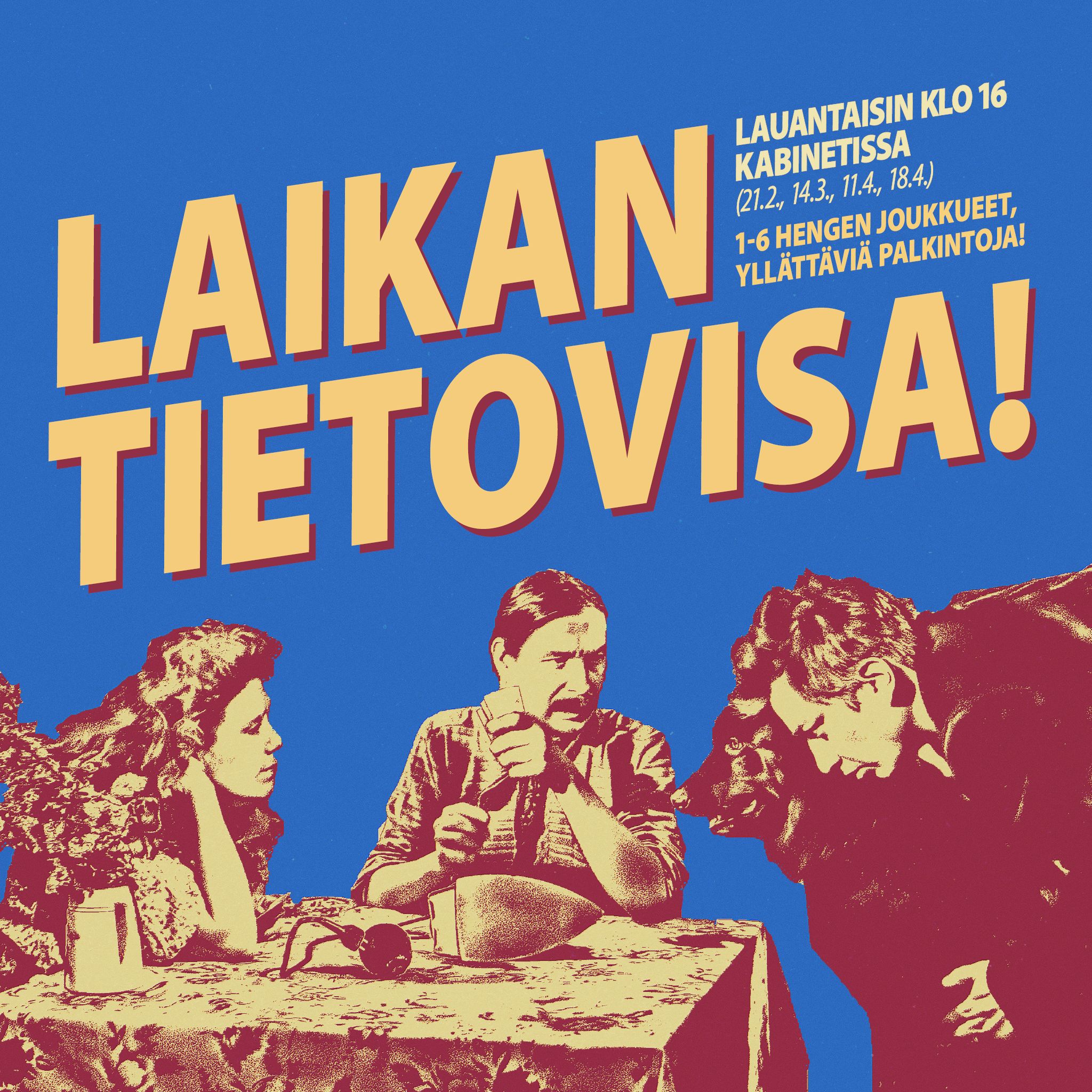 Kino Laikassa tietovisaillaan lauantaisin klo 16! (Seuraavat kerrat: 11.4. ja 18.4.) Laikan tietovisa on kahdenkymmenen kysymyksen yleistietokilpailu 1–6 hengen joukkueille. Kysymykset käsittelevät erilaisia aiheita luonnosta ja politiikasta maantieteeseen ja dadaan. Kisat järjestetään kabinetissa ja ne kestävät tunnista kahteen visailijoiden määrästä ja ripeydestä riippuen. Ota baarista juoma ja tule arvuuttelemaan kinkkisten kysymysten äärelle. Vapaa pääsy ja […]